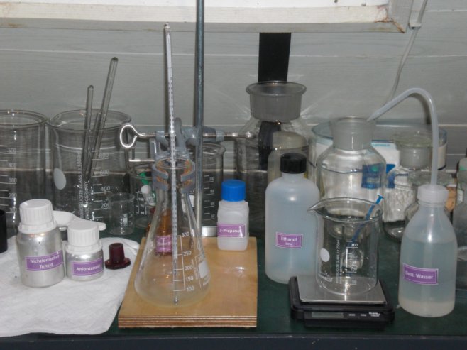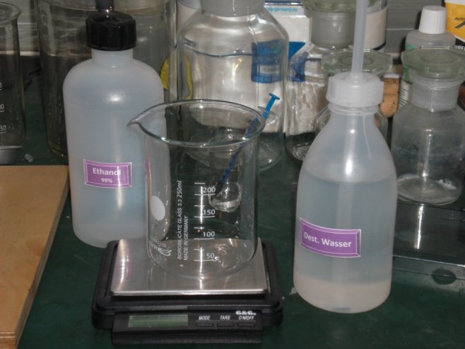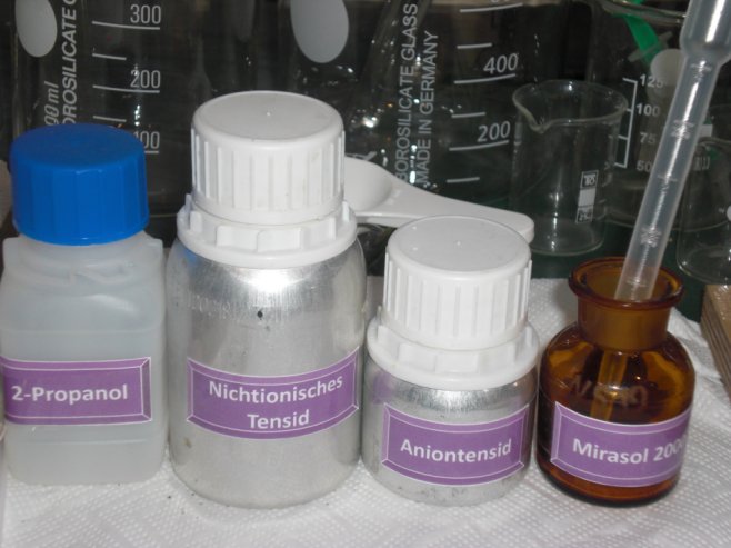 Sie brauchen für den Ansatz natürlich kein Labor. Was allerdings benötigt wird ist ein wenig Equipment wie Pipetten, Rührstäbe, Waage oder Messgefäß. Natürlich benötigen Sie auch die notwendigen Chemikalien. 1. Ethanol min.99%ig 2. Isopropanol min. 99%ig 3. Destilliertes Wasser, zur Not auch Vollentsalztes (Ionenaustauscher Wasser) 4. Anionentensid (z.B. Texapon) 5. Nichtionisches Tensid (z.B. Genaminox) 6. Antistatikum Während die Positionen 1 bis 3 noch einigermaßen gut erhältlich sind ist der Bezug von Tensiden, insbesonder in den kleinen Mengen, sehr schwierig. Aber es gibt dafür eine einfache wie pragmatische Lösung. Handspülmittel enthalten u.a. genau die benötigten Tenside. Der Einsatz des Antistatikums ist eigentlich nur im 3 stufigen Reinigungsverfahren (vgl. plattenreinigung.de) sinnvoll einsetzbar, kann aber auch als Komponente in der Vollwaschlösung zum Tragen kommen. Rezeptur, bezogen auf 1000g Reinigungslösung. Sofern Ihnen keine Waage zur Verfügung steht, können Sie die Mengen auch mit einem Meßgefäß bestimmen. So genau kommt es nun doch nicht wieder drauf an. Der Vollständigkeit halber sind die entsprechenden Volumina für die beiden Alkohole als Milliliter Angabe der Rezeptur beigefügt. 30% 300g Isopropanol oder 384ml Isopropanol 99%ig 10% 100g Ethanol oder 126ml Etanol 99%ig 0,05% 0,5g Tensidgemisch oder 3-5 Tropfen Pril oder Fairy 0,25% 2,5g Mirasol 2000 59,7% 597g Dest. Wasser Ansatz: Wiegen oder messen Sie die entsprechenden Mengen Ethanol und Isopropanol ab.Geben Sie in die Lösung die abgewogene Menge (ggf. mittels Pipette ermittelte Anzahl Milliliter) an Tensid oder 3-5 Tropfen Handspülmittel und vermischen das Ganze durch rühren mit einem Glastab. Bitte unbedingt beachten: Es darf KEIN ELEKTRISCHER RÜHRMOTOR verwendet werden. Ethanol und Isopropanol sind in hoher Konzentration leicht flüchtig und brennbar. Zum Schluss kommt noch die Menge an dest. Wasser und Mirasol 2000 hinzu. Die Mischung wird gerührt und anschließend für ca. 1/2 Std. stehen gelassen. Am besten decken Sie die Lösung mit mit einem Deckel/Teller/Stretchfolie ab. Nach der 1/2 Std. Ruhezeit kann die Lösung in ein Vorratsgefäß gefüllt werden. | ||||||||||||||||||||||||||||||||||||||||||||||||||||||||||||||||||||||||||||||||||||||||||||||||||